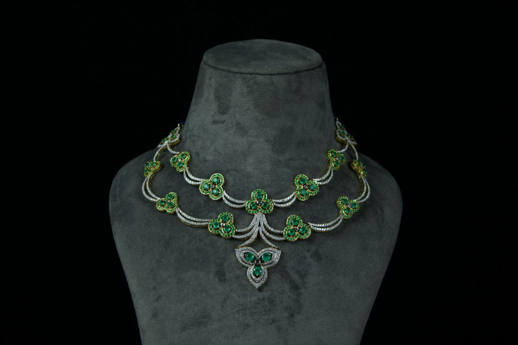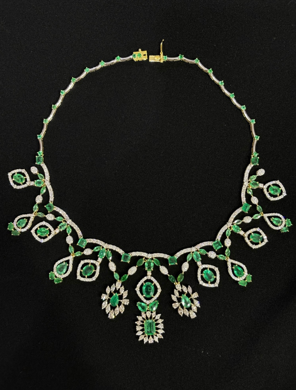 Intricately crafted, each emerald-encrusted motif mirrors the elegant tracery patterns, evoking the same sense of awe and refinement found in ancient European cathedrals. The interwoven strands of dazzling diamonds and vibrant emeralds create an architectural harmony, much like the intricate patterns of these iconic windows. The central pendant, reminiscent of ornamental quatrefoils and pointed arches, symbolizes prosperity, nobility, and enduring beauty—qualities befitting a true Maharani.